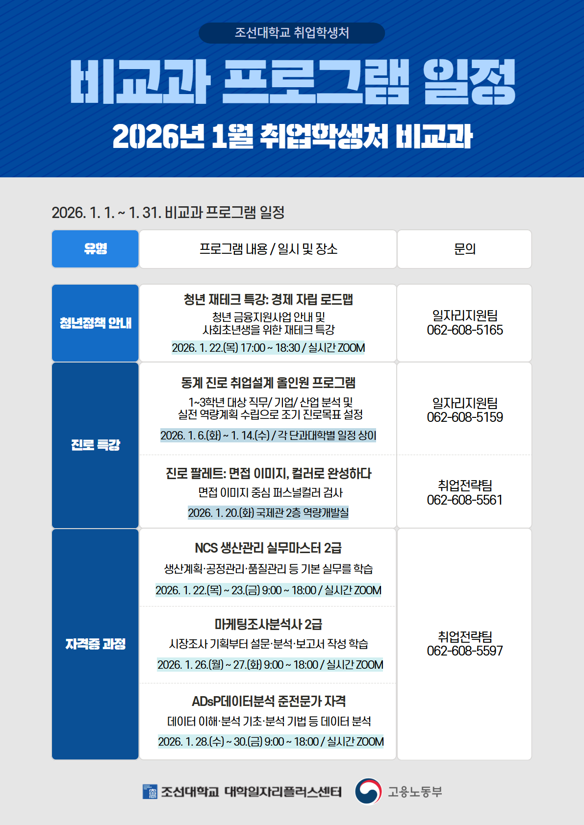 조선대학교 대학일자리플러스센터, 취업전략팀, 원스톱학생상담센터 등 학생 취업지원 부서에서는 우리대학 재학생 및 졸업생을 대상으로 진로/취창업 비교과 프로그램을 진행하고 있습니다.