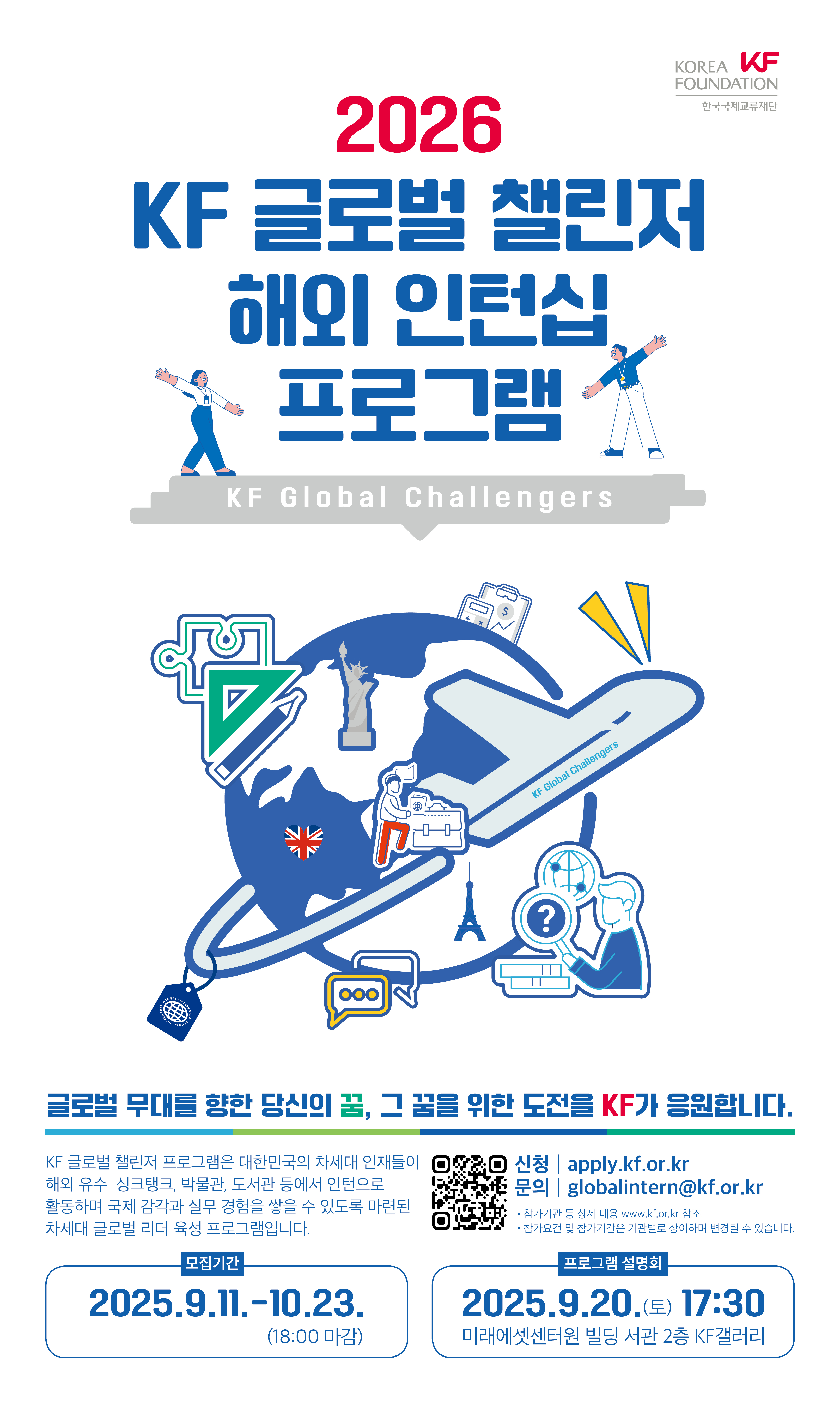 재단은 국내 차세대 인재들이 해외 주요 정책연구소, 박물관 및 도서관 등에서 인턴으로 활동하며 국제적 감각과 실무 경력을 쌓을 수 있도록 2011년부터 ‘KF 글로벌 챌린저’ 프로그램을 시행, 2024년까지 22개국 73개처에 455명을 파견하여 글로벌 리더 양성에 기여해왔습니다. 이와 관련, 해당 프로그램의 2026년도 참가자를 모집하오니 본교 학생들의 많은 관심과 참여바랍니다.