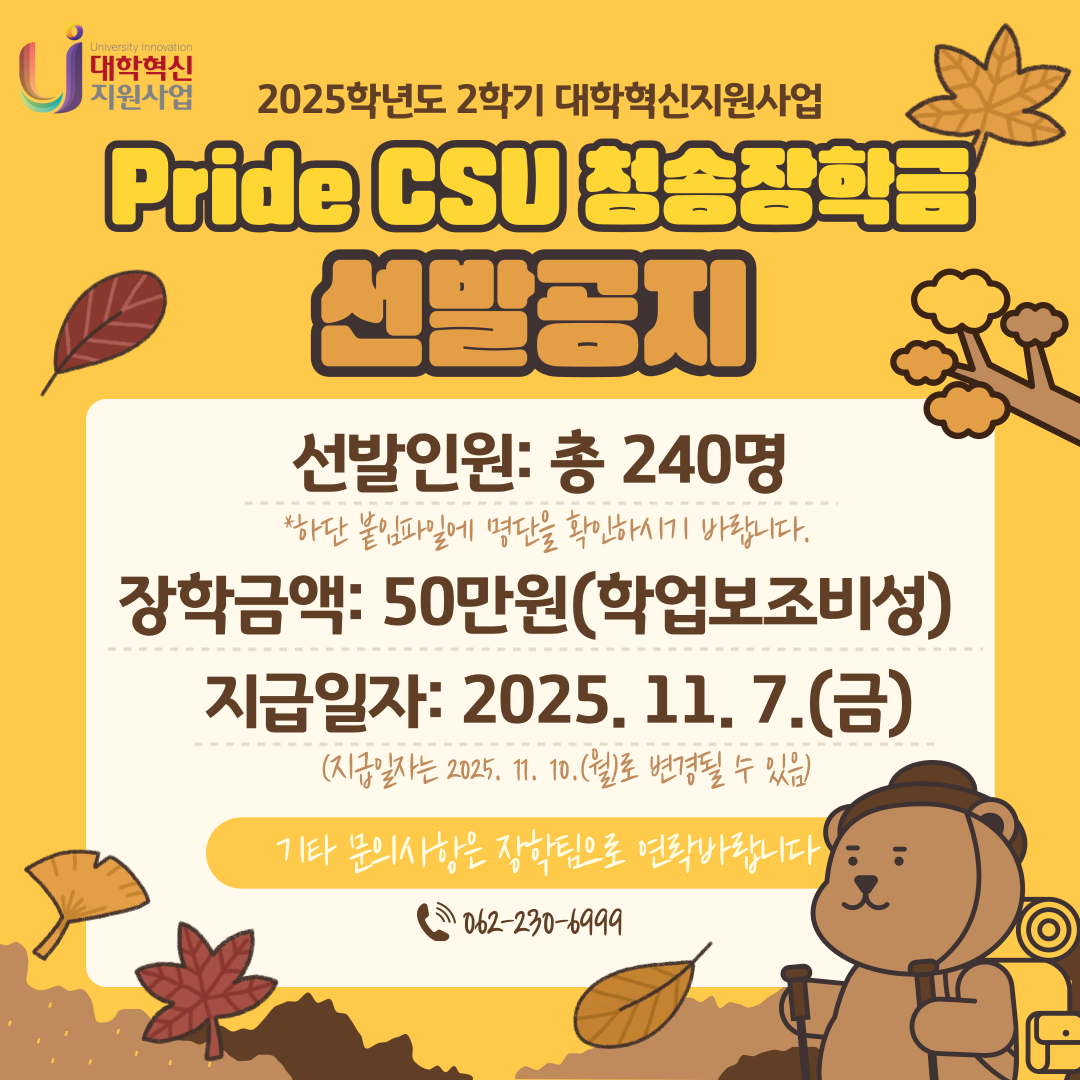 [선발 결과] 2025학년도 대학혁신지원사업 Pride CSU 청송장학금 선발결과 공지