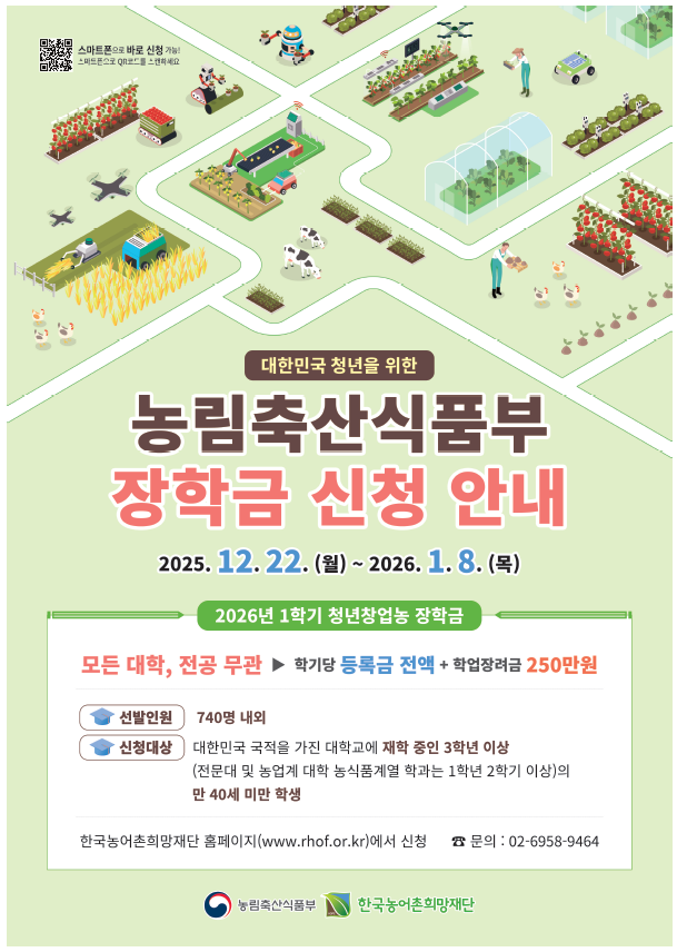 [한국농어촌희망재단]2026-1학기 농림축산식품부 청년창업농장학금 장학생 신청안내
