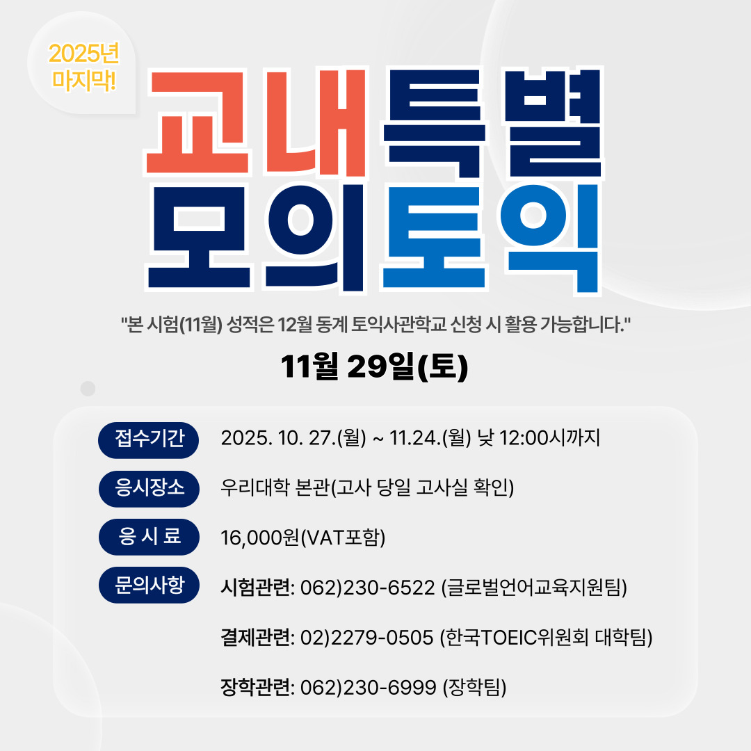 *2025년 마지막* YBM 한국토익위원회 주관 본교 특별 TOEIC 시험 실시 안내(11.29)