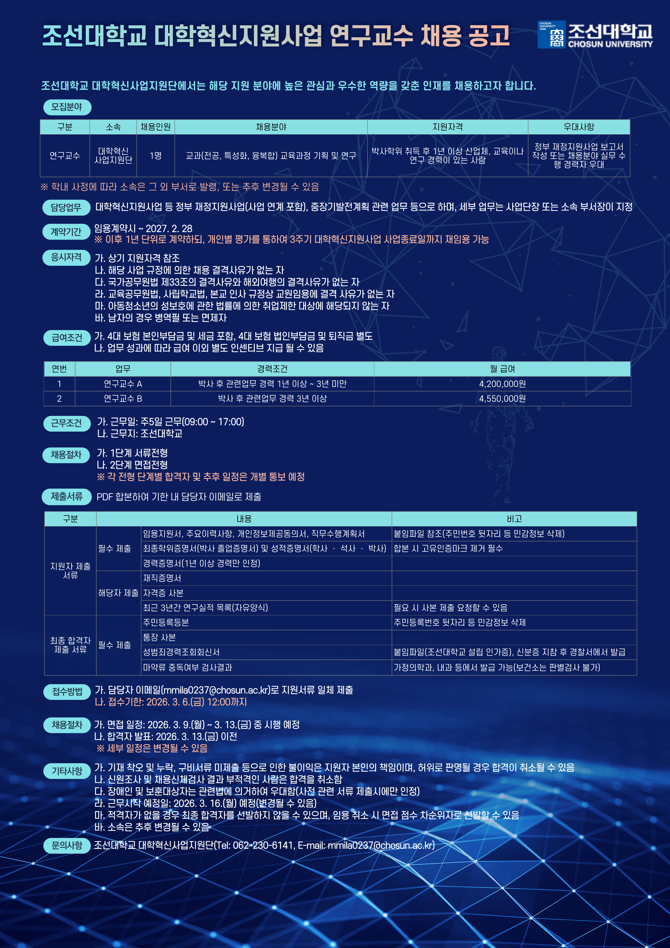 완료 조선대학교 대학혁신지원사업 연구교수 채용 공고