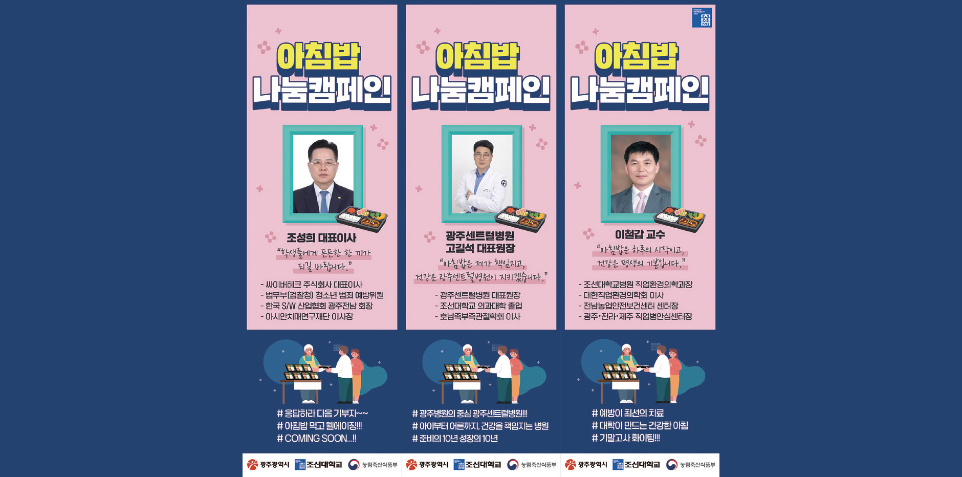 이날 나눔 행사에는 ▲10일 싸이버테크 조성희 대표 ▲11일 광주센트럴병원 고길석 대표원장 ▲15일 조선대 의학과 이철갑 교수 총 3명의 ‘천원의 아침밥’ 기부자들이 함께 참여해 학생들을 직접 만나 도시락을 전달하며, ‘따뜻한 아침 한 끼가 학생의 하루를 바꾸고, 대학의 내일을 바꾼다’는 메시지와 격려의 마음을 전했다.